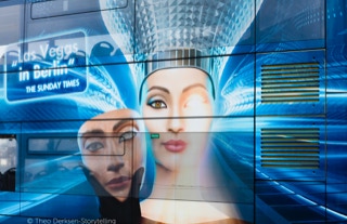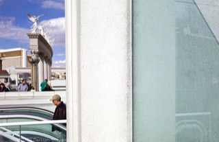 The registration of the social real presents us with people’s dormancy and passivity, a certain obliviousness to the images that now fill their worlds. The action and animation seems to all be in the image world. Derksen is fascinated in showing us the fractures and disorientating effect of the theme park world of urban spaces, even going as far as to invert a few photographs in the book to further confuse us. But the way in which he photographs people in these cities means they neither compete with nor contest that image world. In one of the most charged juxtapositions, taken in Dubai, a worker is enmeshed by the cage trolley he is pushing and dwarfed by the orientalising image of a woman’s face behind him. Setting up a fantasy of sexual enslavement, the woman in the huge ad is adorned and eroticised with decorative chains, one of which suggestively runs through her mouth. All this is played out against the implied subservience and entrapment of the worker. The image spectacle is not undone or unmasked here, instead Derksen’s photograph shows how its allure and spell dominates and binds